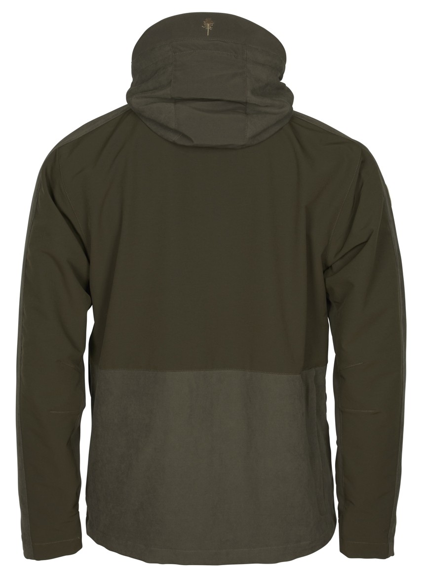 Horní čát zadního dílu a spodní části rukávů jsou z pružného materiálu. Zadní díl je mírně prodloužený a spodní okraj bundy lze stáhnout pomocí gumičky s jezdci. Odepínací kapuca je vybavena kšiltem a lze ji stáhnout na vícero místech, aby správně držela a co nejlépe chránila hlavu i obličej před deštěm.