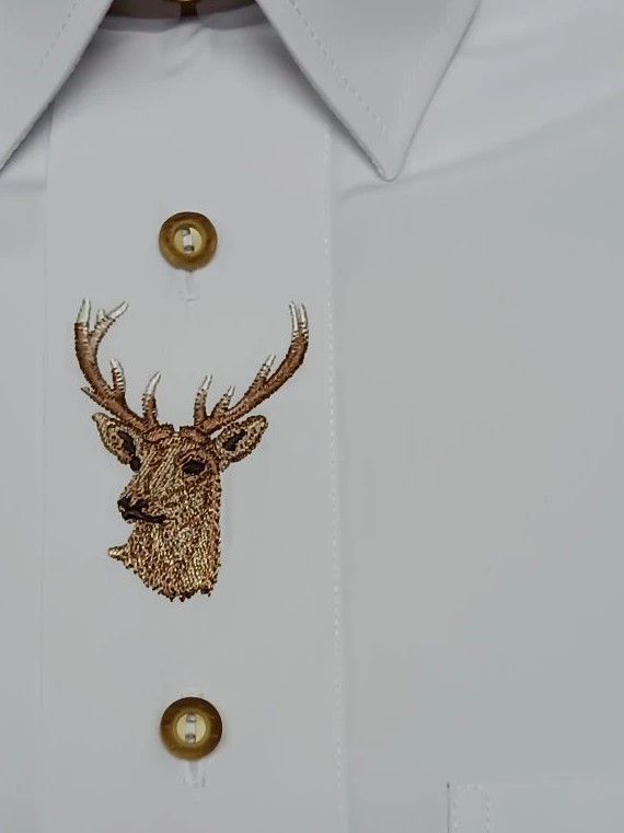 Pánská společenská bílá košile rovného střihu "Comfort" s dlouhým rukávem ze směsového materiálu, zdobená hnědou výšivkou jelena. Výšivku velmi pěkně doplňuje hnědé lemování kapsiček, které mají zapínání na knoflík. Sladění hnědé výšivky, hnědého lemování kapes a hnědých parohových knoflíčků na bílé košili působí velmi pěkným a elegantním dojmem.