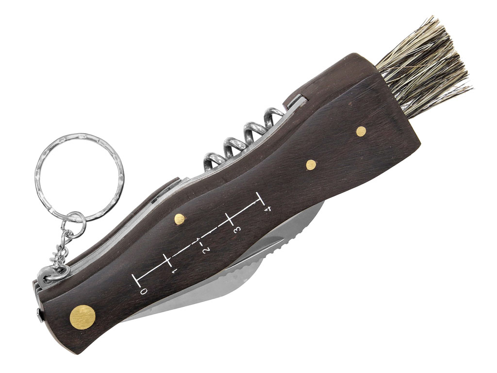 Multifunkční zavírací houbařský nůž Albainox 10592 se zahnutou čepelí, štětečkem, vývrtkou, otvírákem na lahve a konzervy, pinzetou a pouzdrem. Nůž má zahnutou hlavní čepel z nerezové oceli, pro snadné opracování hub a štěteček na čištění. Rukojeť je dřevěná, na levé straně je natištěné orientační měřidlo a do přední části rukojeti, je vložena malá pinzeta. Nůž je opatřen krátkým řetízkem s kovovým kroužkem, pro zavěšení např. na karabinu. Nůž je dodáván včetně nylonového pouzdra. konstrukce nože: zavírací ostří nože: hladké tvar čepele: special barva čepele: stříbrná klasická rukojeť: dřevo barva rukojeti: tmavě hnědá (téměř černá) délka čepele: 7,5 cm délka rukojeti : 11 cm celková délka: 18,5 cm hmotnost nože: 145 g