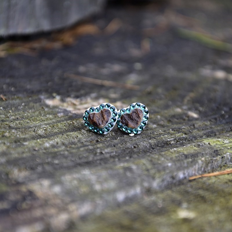 Zeptejte se nás na produkt šperk z lesa - náušnice srdíčka se smaragdově zelenými kamínky - Art&Nature