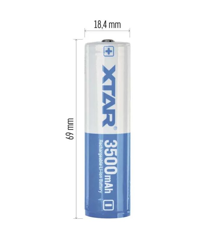 Nabíjecí baterie Xtar 18650, 3500 mAh Li-ion, 3,6V má ochranný obvod a je tedy určena i pro použití v nabíjecích svítilnách, fotopastech, digitální optice, termovizích apod. Lze ji nabíjet uvnitř zařízení zabudovaným nabíječem, nebo externě speciální nabíječkou.