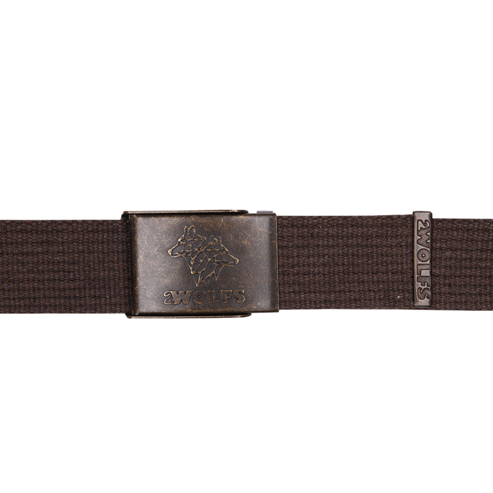 Hlavním funkčním prvkem opasku je kvalitní kovová spona s gravírovaným logem 2WOLFS, která představuje dvě stylizované vlčí hlavy.