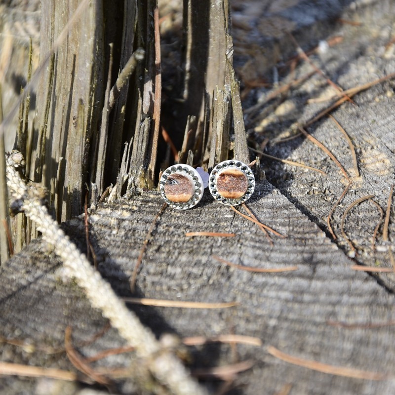 Šperk, který vznikl v lese. Náušnice - pecky z parohu a chirrurgické oceli, zdobené šedými kamínky.