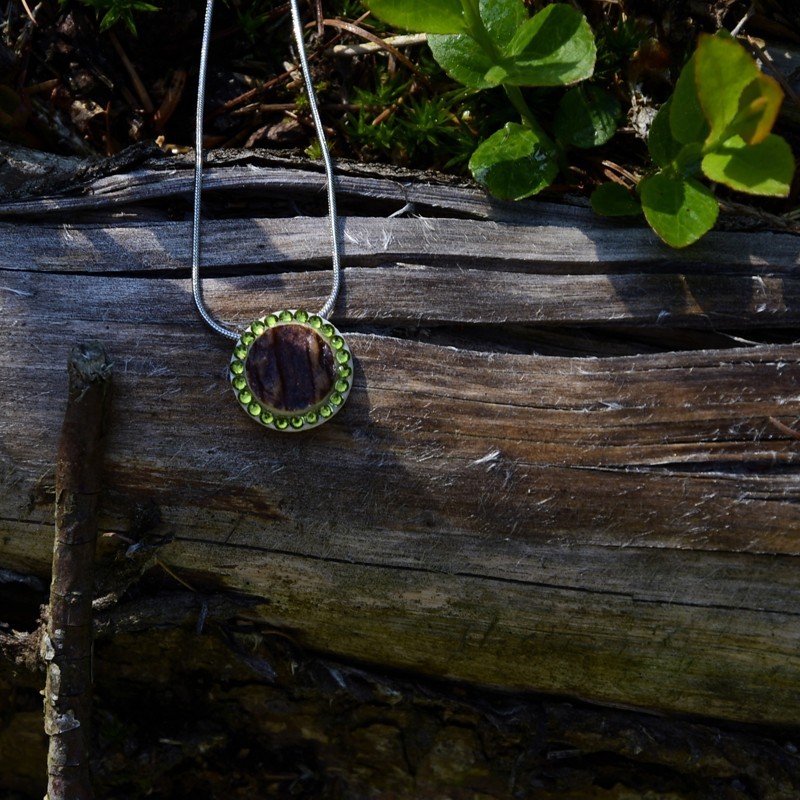 Šperk, který vznikl v lese. Kolečko z parohu zdobené olivově zelenými kamínky Swarovski Crystals, na řetízku z chirurgické oceli.