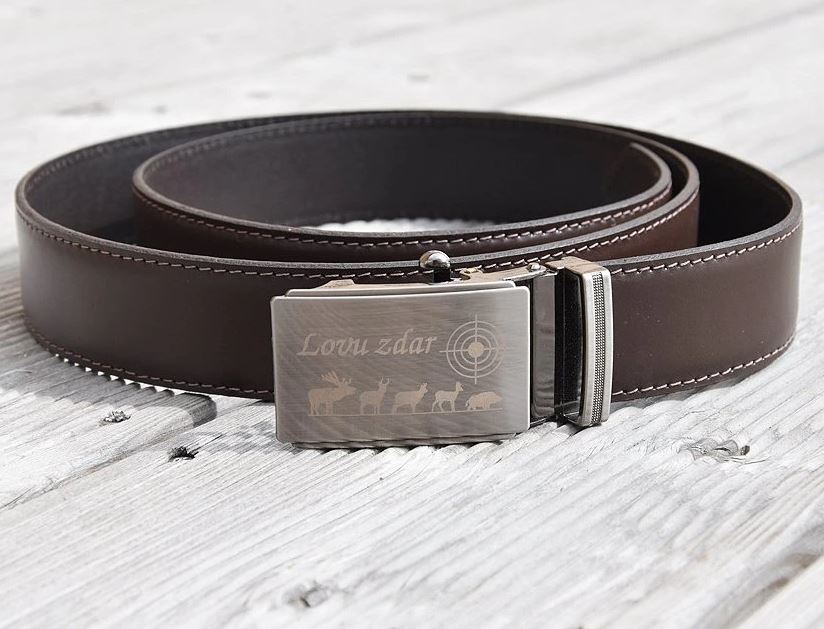 Kožený pásek s vygravírovaným motivem "Lovu zdar" na přezce. Opasek je vhodný ke společenskému obleku či uniformě.